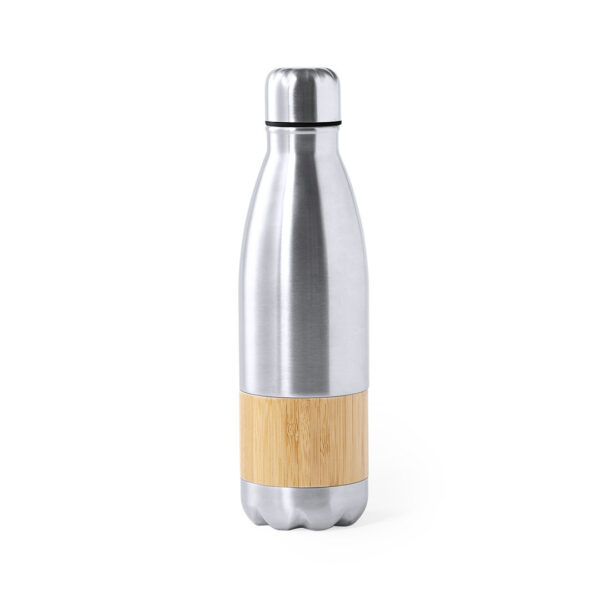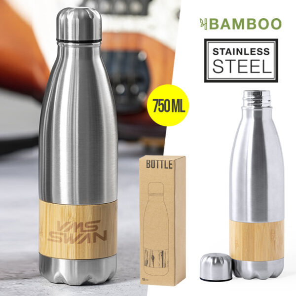 Bidón de línea nature, en combinación de materiales acero inox de acabado mate y bambú. 750ml de capacidad, con tapón de seguridad y presentado en atractiva caja de diseño eco. 750 ml