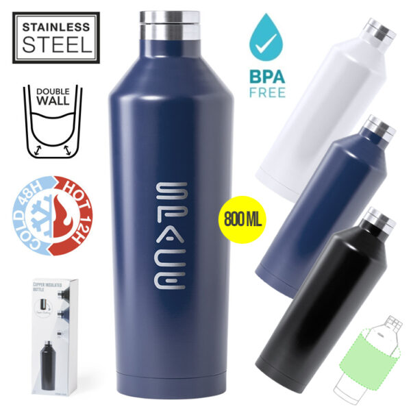Bidón térmico de acero inox, con doble pared y aislamiento de cobre al vacío, que permite mantener el calor y el frio durante un tiempo más prolongado, llegando a las 12 y 48 horas respectivamente. De 800ml de capacidad, con tapón de seguridad libre de BPA y disponible en variada gama de colores metalizados. Presentado…